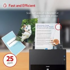 Fast and efficient: Scans both sides of a document at the same time, in color, at up to 25 pages per minute, with a 30 sheet automatic feeder, and one touch operation