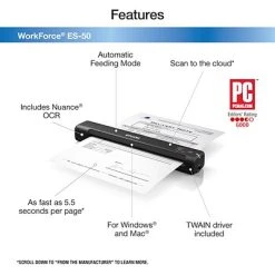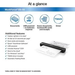 The fastest and lightest mobile single-sheet-fed document scanner in its class, the WorkForce ES-50 features fast speeds, scanning a single page in as fast as 5.5 seconds. This small, portable scanner accommodates extra-long pages, ID cards and more. Epson® ScanSmart Software enables you to easily scan, review and save important files, while the Automatic Feeding Mode makes it easy to combine multi-page scans into one file. With Nuance® OCR included, you can create searchable PDFs and editable Word and Excel® files. Windows® and Mac® compatible, the scanner also includes a TWAIN driver. And, no batteries or external power are required when it’s is connected to a computer via the USB port.
